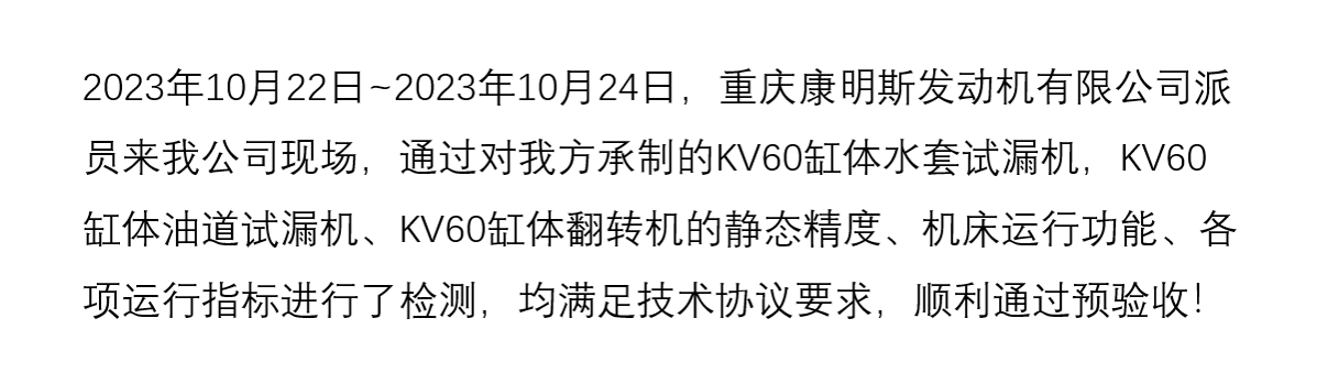 熱烈祝賀重慶康明斯發(fā)動機有限公司KV60缸體水套試漏機、KV60缸體油道試漏機、KV60缸體翻轉(zhuǎn)機順利通過預驗收!