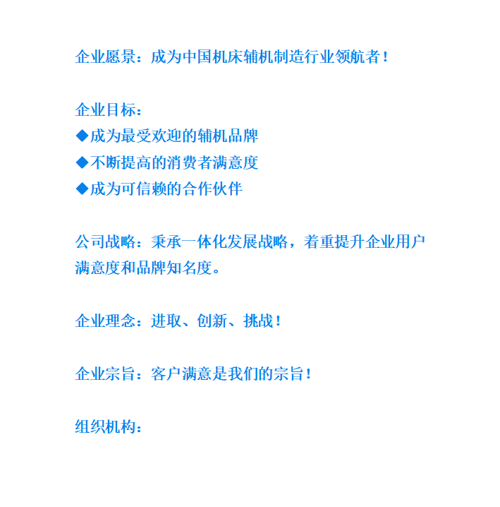 “客戶滿意是我們的宗旨”,更是大連莊河當(dāng)代輔機(jī)制造有限公司的服務(wù)宗旨。企業(yè)將秉承著一體化發(fā)展戰(zhàn)略,著重提升企業(yè)用戶滿意度和品牌知名度,加強(qiáng)與社會同仁和新老朋友的緊密合作,同舟共濟(jì),眾志成城,使當(dāng)代輔機(jī)真正成為機(jī)床輔機(jī)行業(yè)的領(lǐng)航者!
